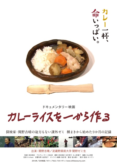 探検家で医師の関野吉晴氏による武蔵野美術大学の課外ゼミ、通称「関野ゼミ」の2015年の活動は、「カレーライスを一から作る」というユニークなものだった。野菜や米・肉はもちろん、スパイスや塩、器やスプーンまでもすべて自分たちで一から作るという途方もない計画だ。「モノの原点を探ると社会が見えてくる。カレー作りを通して色々なことに気付いてもらいたい」という関野の意図のもとに、学生たちは「おいしいカレーが食べたくて…」と集まった。種まきから始まり、思うように育たない野菜作りに悪戦苦闘。世話に励むあまり家畜への愛情が募り、殺すべきか葛藤が生まれ…。